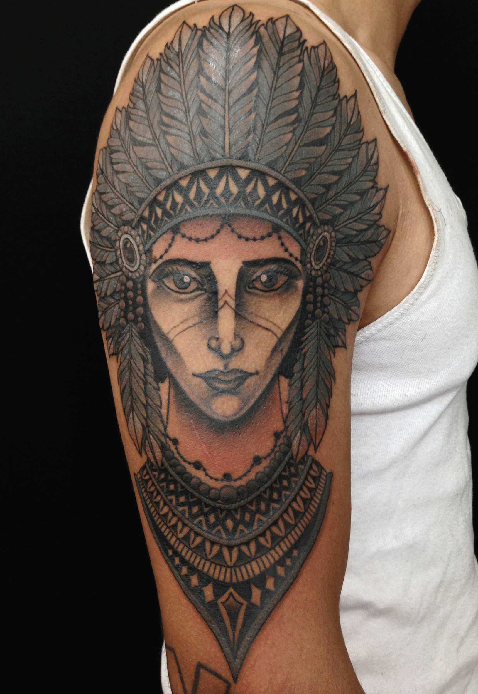 » mark-lonsdale-tattoo-sydney-bondi-girl-head-dress-make-up-geometric-feathers-pattern