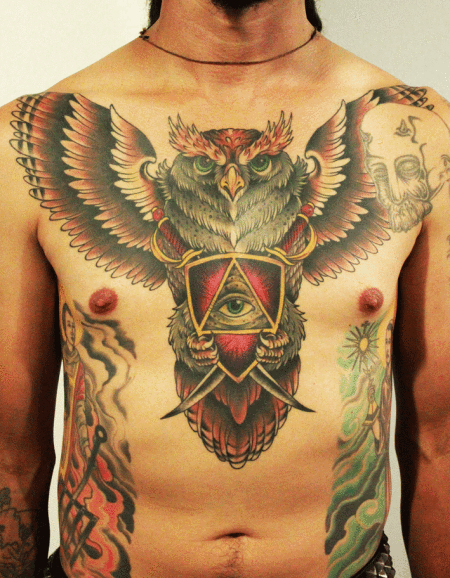 » mark-lonsdale-tattoo-bondi-sydney-owl-chest-piece-shield-swords-all-seeing-eye