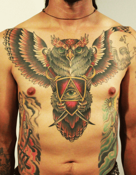 » mark-lonsdale-tattoo-bondi-sydney-owl-chest-piece-shield-swords-all-seeing-eye