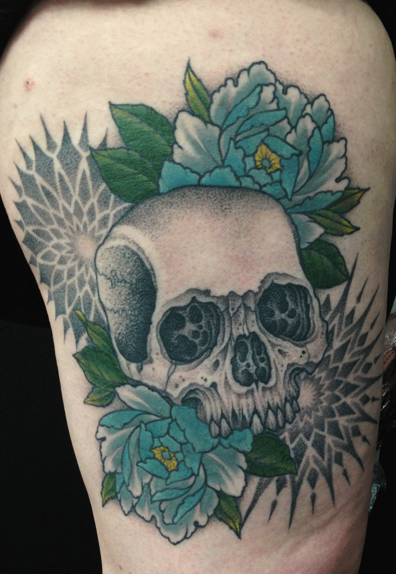 » mark-lonsdale-tattoo-sydney-bondi-skull-peony-peonies-colour-black-and-grey-mandala-pattern-dots-dotwork-detail